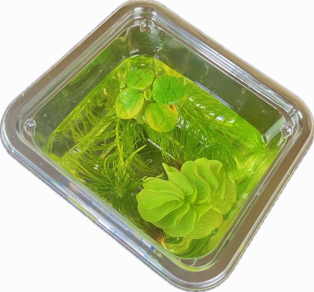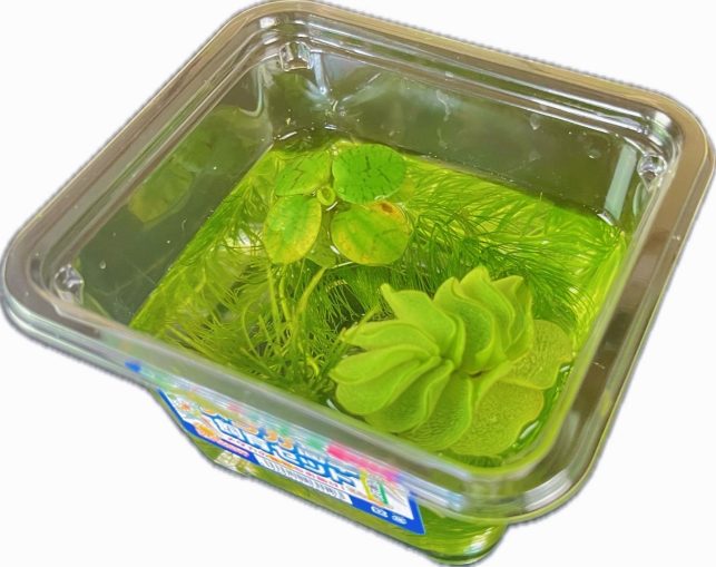 横11㎝×奥行8㎝×縦7.5㎝のカップにサルビニアとアマゾンフロッグピッドとマツモが1個ずつ入っています。